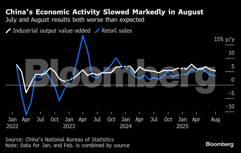 Η οικονομική δραστηριότητα της Κίνας επιβραδύνθηκε περισσότερο από το αναμενόμενο σε όλους τους τομείς τον Αύγουστο, με απότομη πτώση των επενδύσεων, αυξάνοντας την πιθανότητα οι υπεύθυνοι χάραξης πολιτικής να εφαρμόσουν περισσότερα μέτρα τόνωσης της οικονομίας, προκειμένου να διασφαλίσουν ότι η ανάπτυξη θα παραμείνει σε τροχιά για την επίτευξη του επίσημου στόχου.