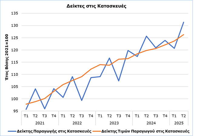 Ο Δείκτης Τιμών Παραγωγού στις Κατασκευές για το δεύτερο τρίμηνο του 2025 ανήλθε στις 126,32 μονάδες (με βάση 2021=100,00), σημειώνοντας αύξηση της τάξης του 2,1% έναντι του πρώτου τριμήνου του 2025. Σε σχέση με το αντίστοιχο περσινό τρίμηνο, ο Δείκτης αυξήθηκε κατά 5,4%.