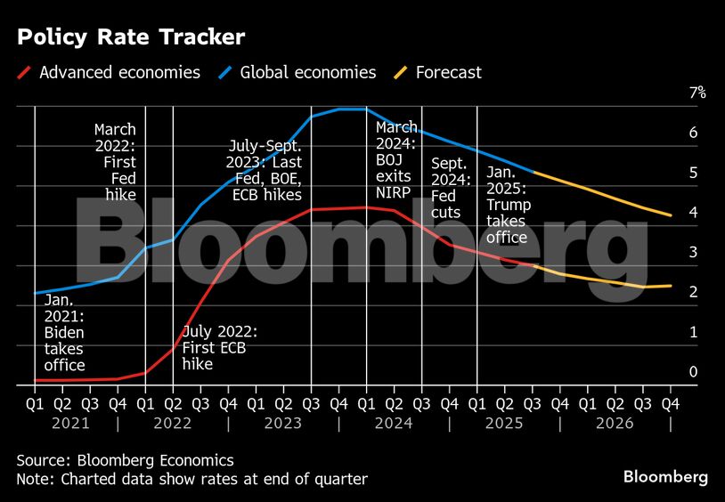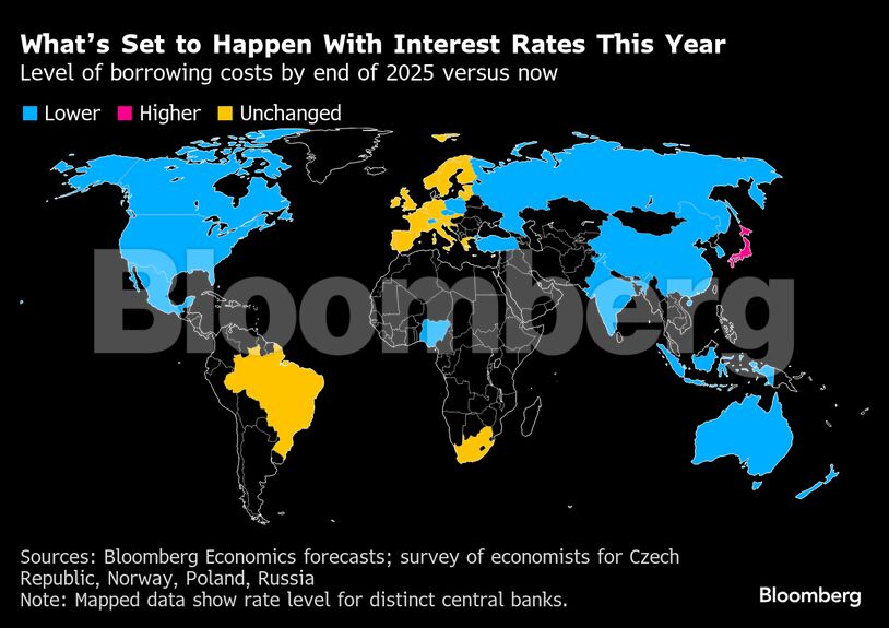 Αυτό, τουλάχιστον, προβλέπει το Bloomberg Economics, με μειώσεις στο κόστος δανεισμού για 15 από τις 23 κεντρικές τράπεζες που περιλαμβάνονται στον οδηγό του πρακτορείου. Εκτός από την Τράπεζα της Ιαπωνίας, η οποία αναμένεται να αυξήσει τα επιτόκια, οι υπόλοιπες αναμένεται να παραμείνουν αμετάβλητες.
