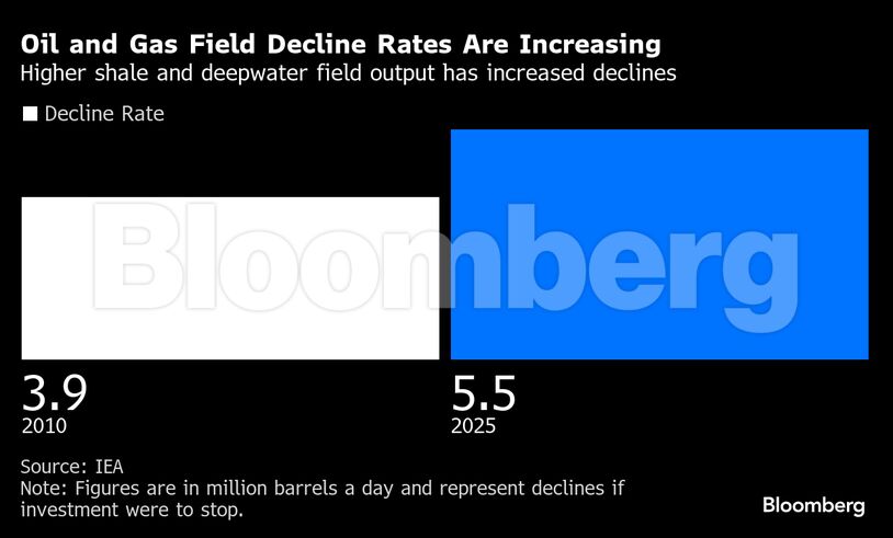 Η νέα έκθεση του Οργανισμού ανέλυσε περισσότερα από 15.000 κοιτάσματα, καταγράφοντας τον επιταχυνόμενο ρυθμό μείωσης της παραγωγής τους. Χωρίς νέες επενδύσεις, η παγκόσμια προσφορά θα μειώνεται κάθε χρόνο κατά 5 εκατ. βαρέλια ημερησίως – ποσότητα αντίστοιχη με την παραγωγή Νορβηγίας και Βραζιλίας μαζί. Ο ρυθμός αυτής της πτώσης είναι 40% υψηλότερος από το 2010, λόγω της αυξανόμενης εξάρτησης από σχιστολιθική παραγωγή στις ΗΠΑ, η οποία εξαντλείται πολύ ταχύτερα από τα συμβατικά αποθέματα.