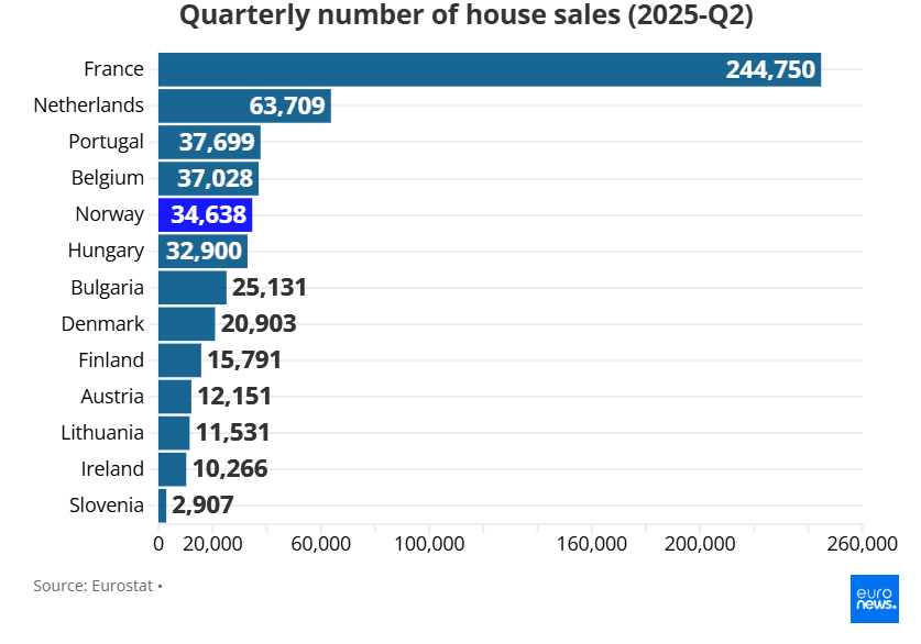 Η αγορά κατοικίας ποικίλλει σε μεγάλο βαθμό σε ολόκληρη την ΕΕ, καθώς οι πληθυσμοί διαφέρουν σημαντικά από χώρα σε χώρα. Το δεύτερο τρίμηνο του 2025, η Γαλλία κατέγραψε σχεδόν ένα τέταρτο του εκατομμυρίου πωλήσεις κατοικιών (244.750).