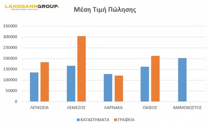 Η αγορά καταστημάτων καταγράφει περισσότερες συναλλαγές σε σύγκριση με αυτή των γραφείων. Κατά το πρώτο εξάμηνο του 2025 καταγράφηκαν 53 πωλήσεις καταστημάτων στη Λευκωσία, 31 στην Λεμεσό, 25 στην Πάφο, 13 στην Λάρνακα και έξι στην ελεύθερη επαρχία Αμμοχώστου. Οι μέσες τιμές πώλησης των καταστημάτων είναι πιο συγκεντρωμένες σε σύγκριση με αυτές των γραφείων δεδομένου ότι υψηλότερη μέση τιμή, που καταγράφηκε στη Λεμεσό ήταν €166.000, ενώ η χαμηλότερη μέση τιμή, η οποία καταγράφηκε στη Λάρνακα ήταν €128.500. Στο μεσοδιάστημα βρίσκονταν οι επαρχίες Πάφου με μέση τιμή πώλησης €162.500 και Λευκωσίας με €135.000. Για σκοπούς καταγραφής σημειώνεται ότι η μέση τιμή πώλησης των έξι καταστημάτων στην ελεύθερη επαρχία Αμμοχώστου ήταν περίπου €202.000.