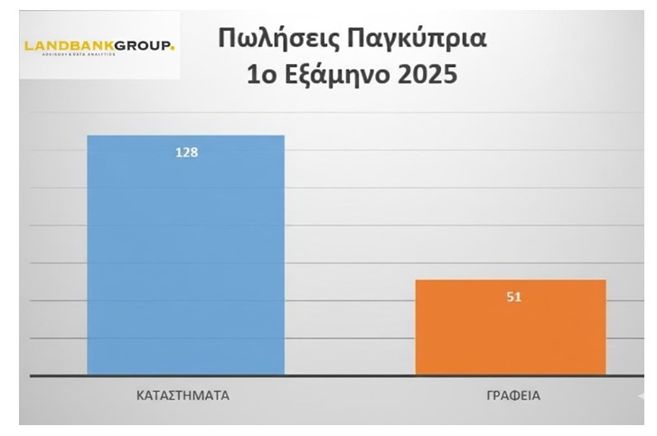 Οι συναλλαγές που αφορούσαν γραφεία και καταστήματα έφτασαν σε αξία στα €29,8 εκατ. Συνολικά, πραγματοποιήθηκαν Παγκύπρια 128 πωλήσεις καταστημάτων αξίας €19,2 εκατ. και 51 πωλήσεις γραφείων αξίας €10,6 εκατ.