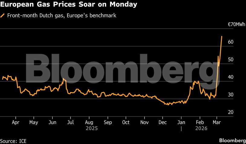 Τα συμβόλαια αναφοράς σημείωσαν άνοδο έως και 30% τη Δευτέρα, επεκτείνοντας τη μεγαλύτερη εβδομαδιαία άνοδο από την περίοδο της ενεργειακής κρίσης. Η κίνηση αυτή ακολουθεί το άλμα των τιμών του πετρελαίου πάνω από τα 100 δολάρια το βαρέλι, καθώς όλο και περισσότεροι μεγάλοι παραγωγοί της Μέσης Ανατολής περιόρισαν την παραγωγή τους, ενώ τα Στενά του Ορμούζ παραμένουν ουσιαστικά κλειστά. Την ίδια στιγμή, τα συμβόλαια φυσικού αερίου στις ΗΠΑ κινήθηκαν επίσης ανοδικά, φθάνοντας στο υψηλότερο επίπεδο του τελευταίου μήνα.