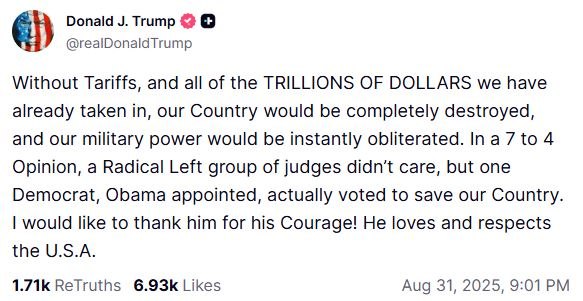 Αφότου ομοσπονδιακό Εφετείο των Ηνωμένων Πολιτειών αποφάνθηκε την Παρασκευή 29 Αυγούστου ότι οι περισσότεροι δασμοί που επέβαλε ο πρόεδρος των ΗΠΑ Ντόναλντ Τραμπ ήταν παράνομοι, επικυρώνοντας την απόφαση κατώτερου δικαστηρίου, ο τελευταίος αποφάσισε να δώσει ακόμα μια απάντηση από την πλατφόρμα του Truth Social.