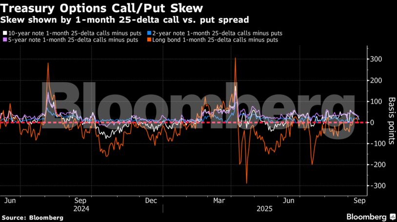 To Treasury options skew συνεχίζει να διαπραγματεύεται σε ουδέτερα επίπεδα σε όλη την καμπύλη, με το μακροπρόθεσμο άκρο να αναστρέφεται πρόσφατα από την προτίμηση για put premium πριν από μερικές εβδομάδες.