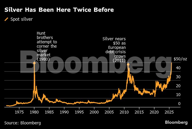 Το ασήμι έφθασε την Πέμπτη στα 51,235 δολάρια ανά ουγγιά – το υψηλότερο επίπεδο των τελευταίων τεσσάρων δεκαετιών – πριν περιορίσει τα κέρδη του. Παρά τη διόρθωση, το μέταλλο παραμένει κατά περίπου 70% υψηλότερο φέτος, ξεπερνώντας κατά πολύ την άνοδο του χρυσού. Το ράλι του αποδίδεται στη γενικευμένη στροφή των επενδυτών προς τα πολύτιμα μέταλλα, λόγω ανησυχιών για υπερθέρμανση των αγορών μετοχών, δημοσιονομικές πιέσεις στις ΗΠΑ και απειλές για την ανεξαρτησία της Ομοσπονδιακής Τράπεζας (Fed).