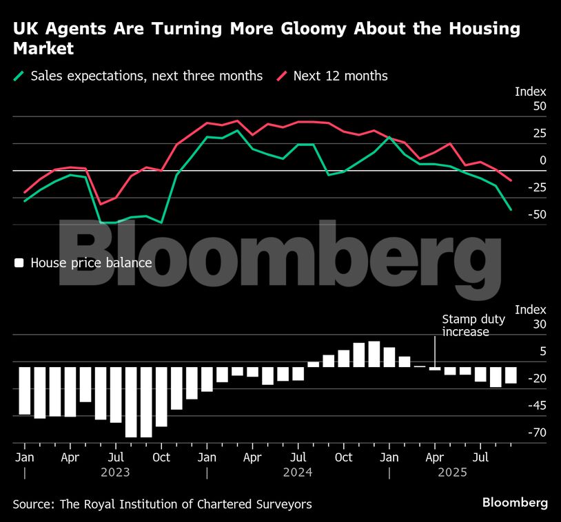 Οι μεσίτες που συμμετείχαν στην έρευνα της RICS ανέφεραν τρίτη συνεχόμενη μείωση του ενδιαφέροντος των νέων αγοραστών, υποδηλώνοντας ότι η εξασθένηση της ζήτησης γίνεται «πιο σταθερή», ενώ ο δείκτης συμφωνημένων πωλήσεων παρέμεινε πολύ κάτω από το μηδέν. Τόσο οι τριμηνιαίες όσο και οι μακροπρόθεσμες προσδοκίες πωλήσεων είναι πλέον αρνητικές, με αποτέλεσμα να μειώνονται οι προσδοκίες για ανάκαμψη, σύμφωνα με το Bloomberg.