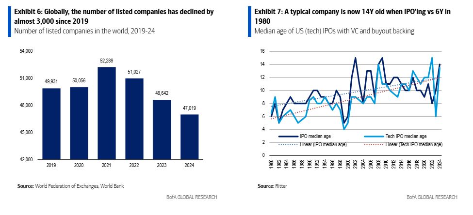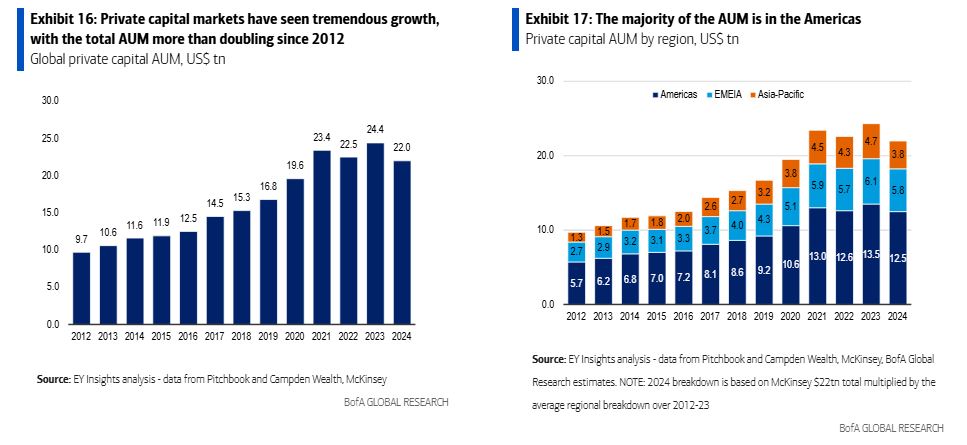 Τα στοιχεία που παρουσιάζει ο αμερικανικός επενδυτικός οίκος αποτυπώνουν μια στροφή από τα χρηματιστήρια, προς τις μη εισηγμένες επιχειρήσεις. Από το 2000, ο αριθμός των εισηγμένων εταιρειών στις ΗΠΑ έχει μειωθεί στο μισό (σήμερα διαμορφώνεται λίγο υψηλότερα από τις 4.000), ενώ ο αριθμός των μη εισηγμένων εταιρειών που χρηματοδοτούνται από venture capital funds έχει 25πλασιαστεί. Τα συνολικά assets ιδιωτικών κεφαλαίων αυξήθηκαν το 2024 στα 22 τρισ. δολάρια, έχοντας υπερδιπλασιαστεί από το 2012.