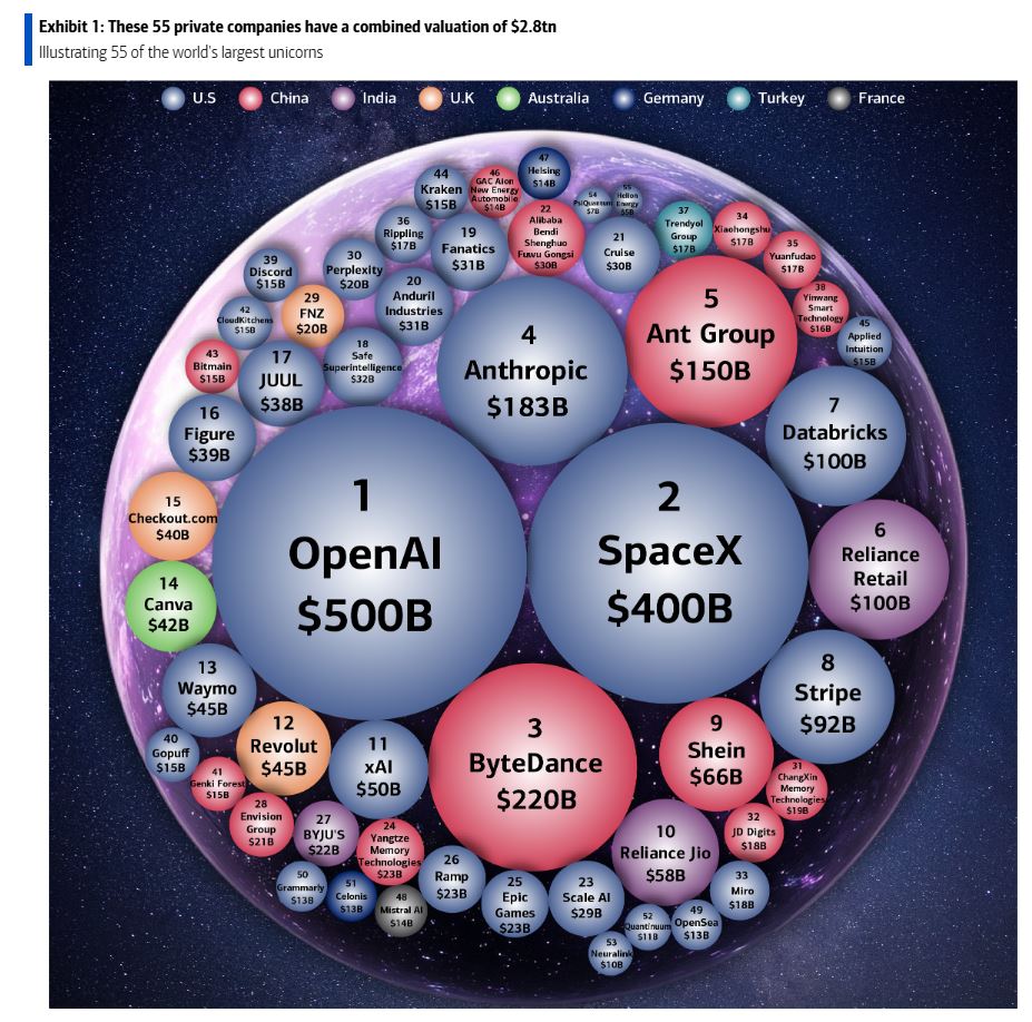 Η Bank of America κατήρτισε το Private Magnificent-7, που αποτελείται από τις εταιρείες Anduril, Anthropic, Databricks, OpenAI, SpaceX, Stripe και xAI, με συνολική αποτίμηση 1,4 τρισ. δολαρίων. Οι εταιρείες αυτές έχουν πενταπλασιάσει την αποτίμησή τους από το 2023.