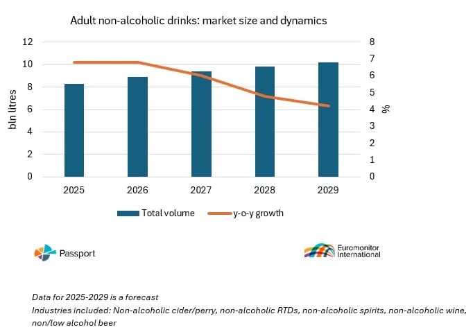 Η Euromonitor προβλέπει ότι η αγορά μη αλκοολούχων ποτών για ενήλικες θα αυξηθεί κατά 24% ως το 2029, ξεπερνώντας τα 10,2 δισ. λίτρα.