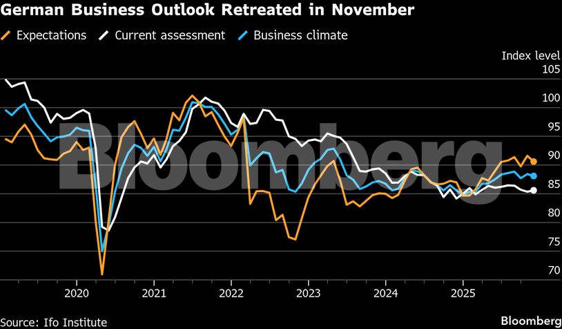 Ο δείκτης προσδοκιών του ινστιτούτου Ifo υποχώρησε στις 90,6 μονάδες από 91,6 τον Οκτώβριο, ενώ οι αναλυτές προέβλεπαν σταθερή εικόνα. Μικρή βελτίωση καταγράφηκε μόνο στην αξιολόγηση της τρέχουσας κατάστασης.