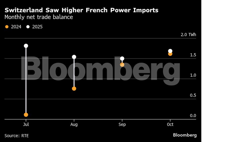 Οι καθαρές εξαγωγές προς την Ελβετία αυξήθηκαν πάνω από 70% σε σχέση με πέρυσι, ενώ προς το Ηνωμένο Βασίλειο ενισχύθηκαν κατά 30%. Η Ελβετία αντιμετωπίζει προβλήματα στη δική της πυρηνική παραγωγή. O σταθμός Μπεζνάου περιόρισε τη λειτουργία του εξαιτίας του φετινού καύσωνα, καθώς οι υψηλές θερμοκρασίες των ποταμών οδήγησαν σε μειωμένη ισχύ και μερικές διακοπές λειτουργίας. Το εργοστάσιο Γκέσγκεν βρίσκεται εκτός λειτουργίας από τον Μάιο λόγω τεχνικών προβλημάτων που εντόπισαν οι ρυθμιστικές αρχές.