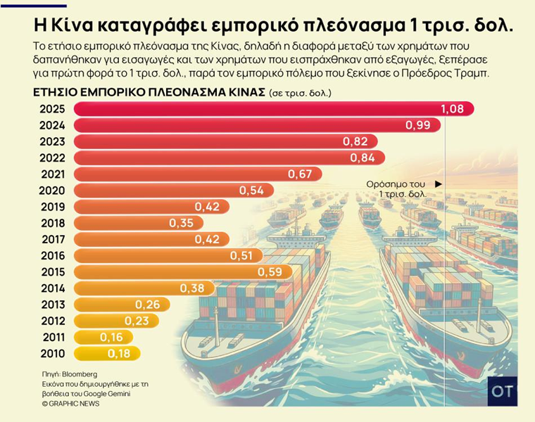 Η Κίνα, η δεύτερη μεγαλύτερη οικονομία του κόσμου συνεχίζει να κατακτά νέα ορόσημα δείγμα μιας δυναμικής που φαίνεται πως δεν εξασθενεί τόσο πολύ όσο θα ήθελαν οι «ανταγωνιστές» της ή θα περίμενε κανείς με δεδομένη την «κατακλυσμιαία» ανατροπή που έφεραν -ειδικά στη διάρκεια του 2025- οι εμπορικοί δασμοί του Αμερικανού προέδρου. Η Κίνα πλέον κατέγραψε εμπορικό πλεόνασμα ενός τρισεκατομμυρίου .