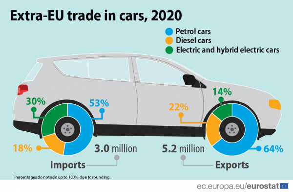 Το 2020, η Ευρωπαϊκή Ένωση (ΕΕ) εξήγαγε περίπου 5,2 εκατομμύρια αυτοκίνητα (βενζίνη, ντίζελ, ηλεκτρικά και υβριδικά ηλεκτρικά αυτοκίνητα), ενώ 3 εκατομμύρια αυτοκίνητα εισήχθησαν.