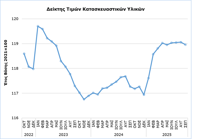 Ο Δείκτης Τιμών Κατασκευαστικών Υλικών για τον μήνα Σεπτέμβριο 2025 ανήλθε στις 118,96 μονάδες (με βάση 2021=100), σημειώνοντας αύξηση 1,44%, σε σύγκριση με τον αντίστοιχο μήνα του προηγούμενου έτους, σύμφωνα με τη Στατιστική Υπηρεσία.