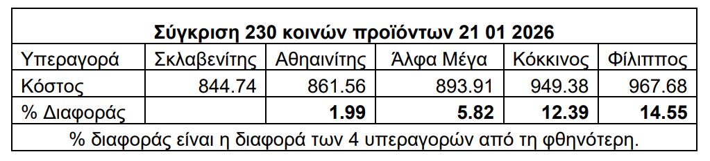 3. Το συνολικό κόστος των 230 κοινών προϊόντων και το ποσοστό διαφοράς του από τη φθηνότερη υπεραγορά καταγράφεται στον πιο κάτω πίνακα