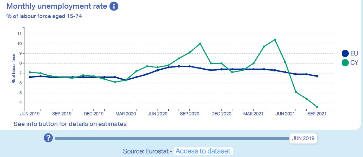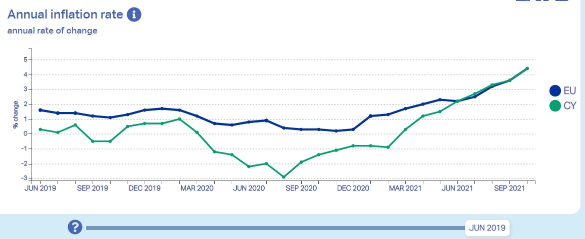 Όπως φαίνεται στα στοιχεία της Eurostat ο δείκτης του πληθωρισμού στην Κύπρο τον Οκτώβρη του 2020, δηλαδή έναν χρόνο πριν, βρισκόταν στο -1.4%.  Στις αρχές του 2021 βρισκόταν στο 2.2% και σταδιακά όπως φαίνεται στο πιο κάτω διάγραμμα «σκαρφάλωσε» στα σημερινά επίπεδα, μαρτυρώντας πως η ανοδική τάση των τιμών είναι δυναμική και κυρίως δεν φανερώνει σημάδια απότομης και άμεσης υποχώρησης.